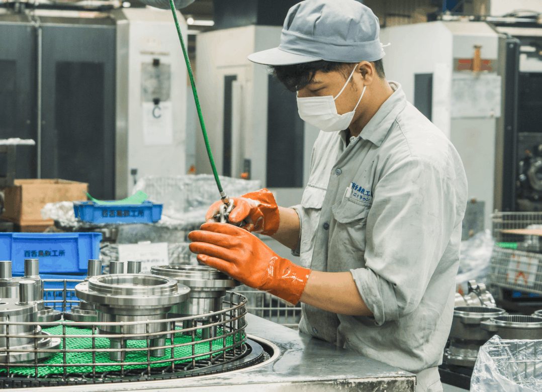 油圧部品では0.005mmの公差を出す超高精度加工を実現。大きな部材を熱処理する際、どうしても歪みが生じますが、当社では特別な手法で製造しており、他社には達成できない精度として優位性を確立しています。